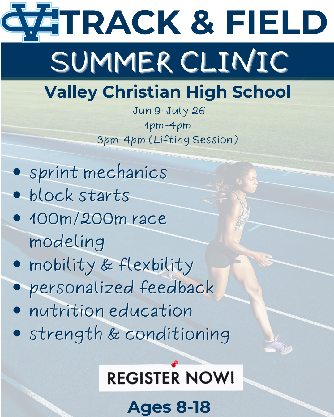 The Valley Christian Track & Field Camp is designed for athletes ages 8–18 who want to improve their speed, technique, and overall performance in a fun, structured environment.